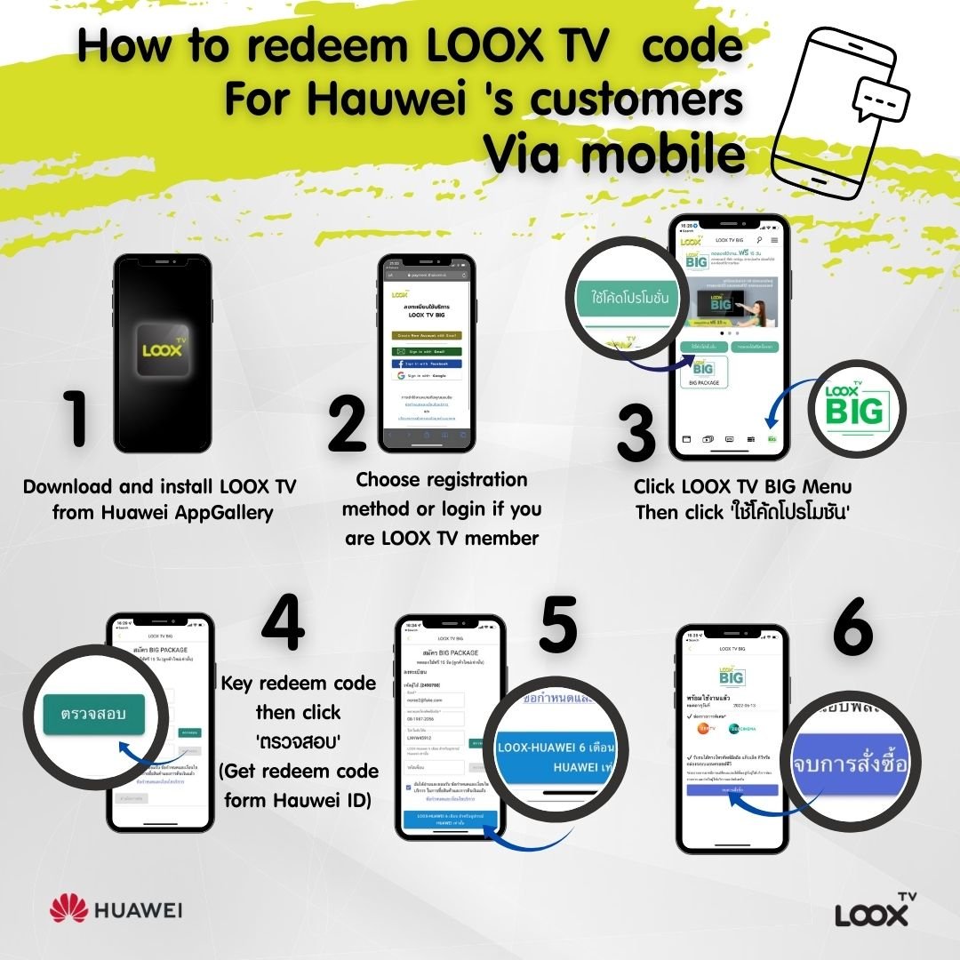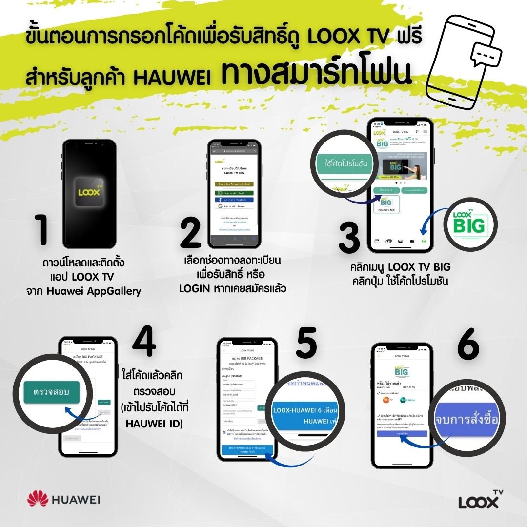 - Receive a promotion code for watching the LOOX TV BIG : “6M Huawei x LOOX TV package” for (Free TV + 2 Special channels, Zee TV และ Zee Cinema exclusively for HUAWEI customer), Free for 6 months
