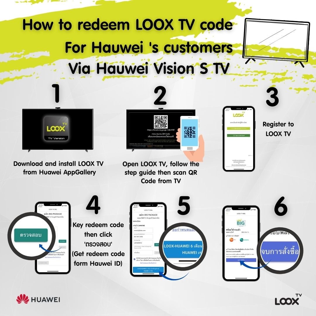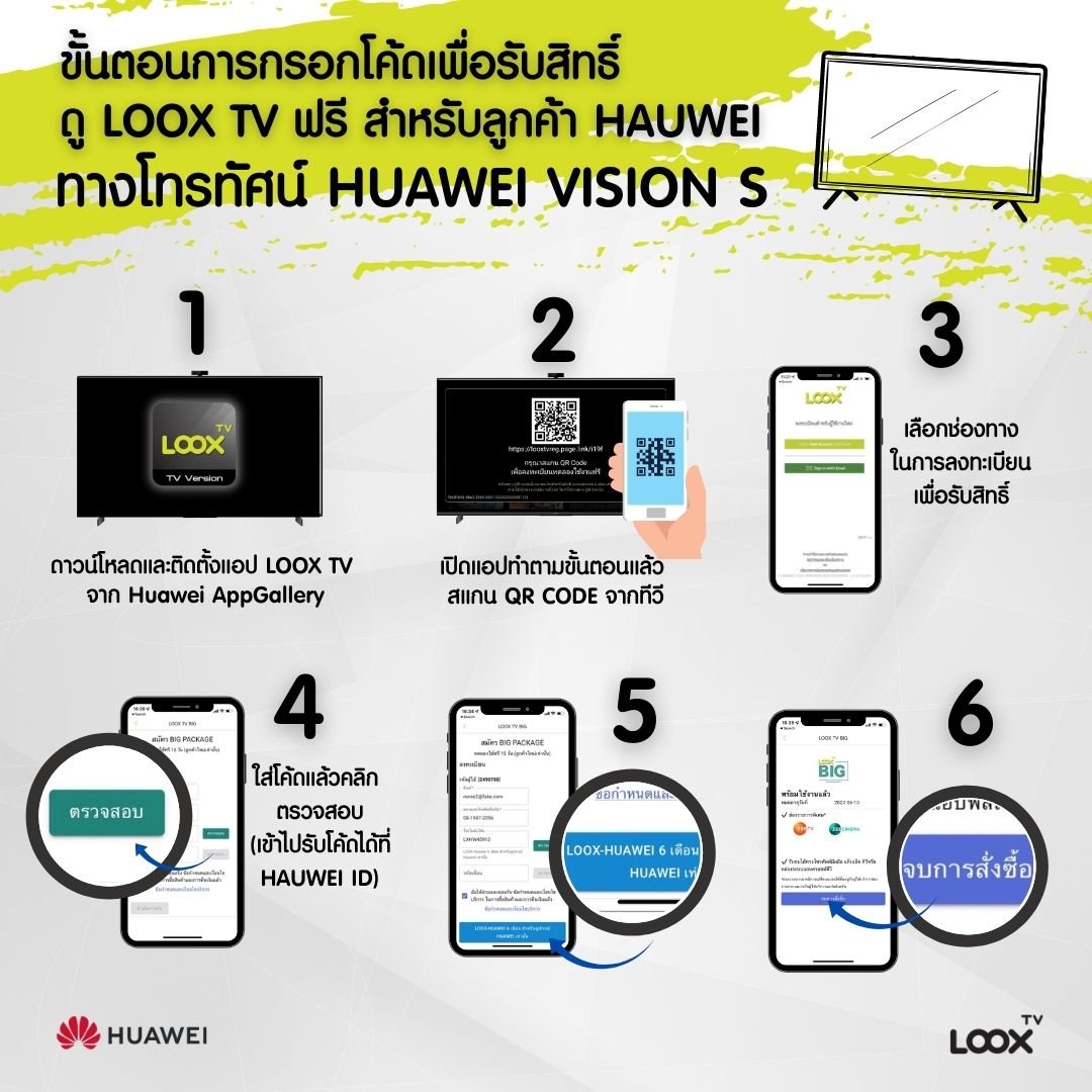 Huawei ร่วมกับ LOOX TV มอบสิทธิพิเศษแก่ลูกค้าที่ซื้อโทรทัศน์ Huawei Visions หรือ ลูกค้า HUAWEI ปัจจุบัน ที่มี HUAWEI ID ด้วยแพกเพจ BIG 6M Huawei x LOOX TV ชมช่องฟรีทีวี ทั้งดิจิทัลทีวีและทีวีดาวเทียมพร้อมช่องพิเศษ ZEE TV และ ZEE Cinema รวมกว่า 50 ช่องผ่านทางแอปพลิเคชั่น LOOX TV นาน 6 เดือน ใช้สิทธิ์ได้ตั้งแต่บัดนี้จนถึง 18 มิ.ย. 65