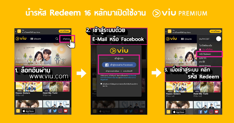 สำหรับลูกค้าที่ซื้อแพ็คเกจและได้รับโค้ด Viu Premium ทาง SMS แล้วกรุณานำโค้ดที่รับมา Redeem ตามวิธีการดังนี้
