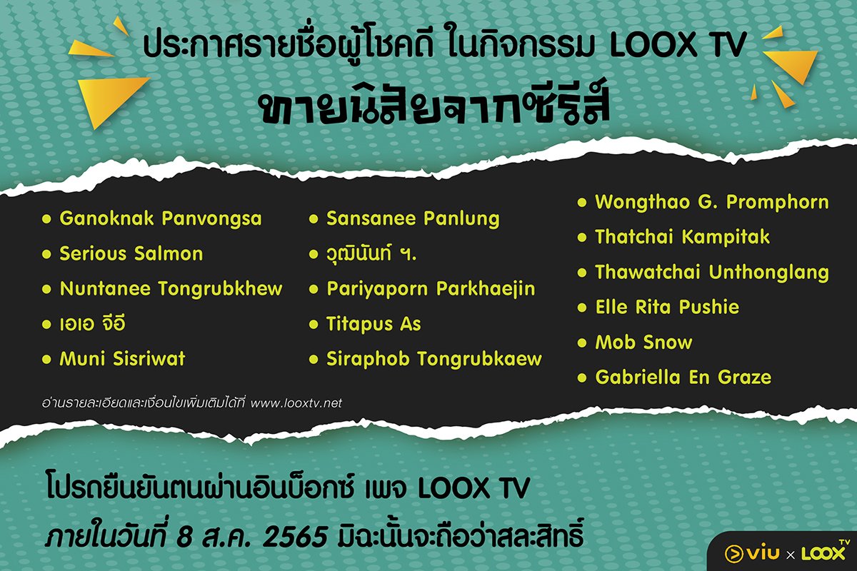 ► ผู้โชคดีโปรดยืนยันตนผ่านอินบ็อกซ์ เพจ LOOX TV ภายในวันที่ 8 ส.ค. 2565 มิฉะนั้นจะถือว่าสละสิทธิ์