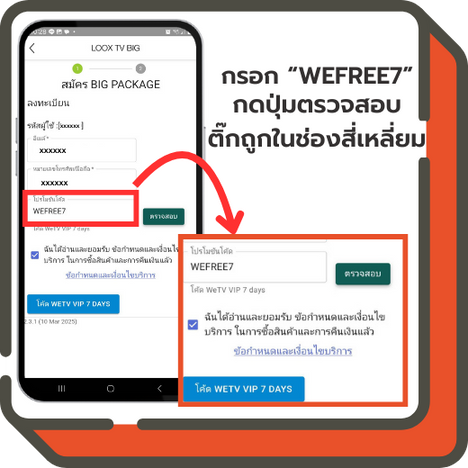 3. สำหรับสมาชิก LOOX TV BIG แบบตัดบัตรเครดิตอัตโนมัติ หากมีการตัดยอดบัตรฯ ในช่วงระยะเวลาโปรโมชั่นที่กำหนด (เกิดการสั่งซื้อช่วงเวลา 18 เม.ย. 68-20 พ.ค. 68) สามารถร่วมกิจกรรมได้ โดยแจ้งแอดมิน LOOX TV (ทาง Line หรือ inbox Facebook) โดยแจ้งรหัสสมาชิกและอีเมล์ พร้อมพิมพ์ว่าร่วมสนุกกับ WEFREE7