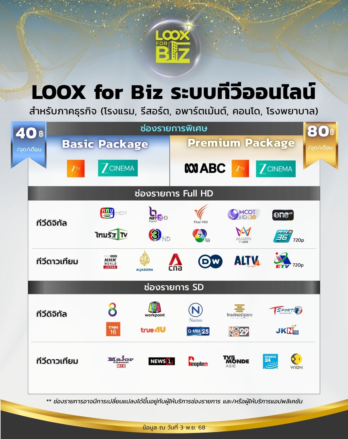 LOOX For Biz ระบบรับชมช่องรายการทีวีออนไลน์ภายในอาคาร สำหรับโรงแรม อพาร์ตเมนต์ คอนโด โรงพยาบาล หน่วยงานราชการ สถานศึกษา อาคารสำนักงาน ฯลฯ รับชมผ่านทางโทรทัศน์ภายในอาคารได้หลายจุดพร้อมกัน ส่งสัญญาณผ่านอินเทอร์เน็ต แค่โหลดแอปพลิเคชันก็ดูได้ เลือกช่องพิเศษเพิ่มเติมได้ตามกลุ่มเป้าหมาย