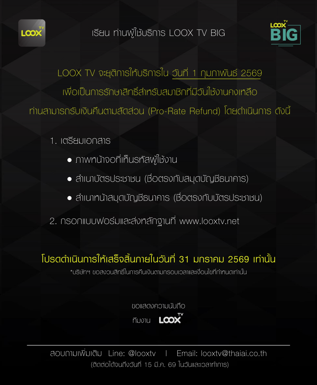 เรียน ท่านผู้ใช้บริการ LOOX TV BIG
